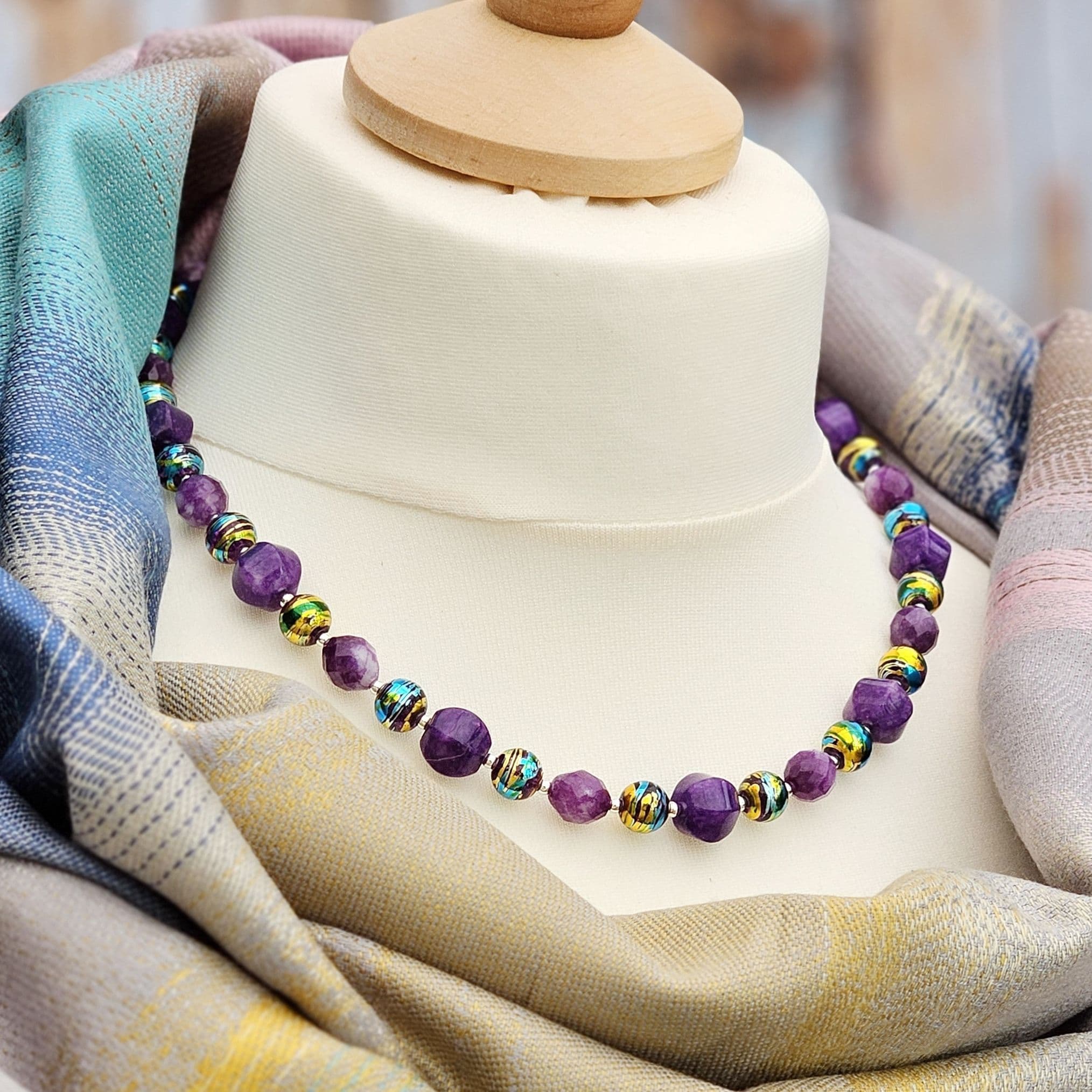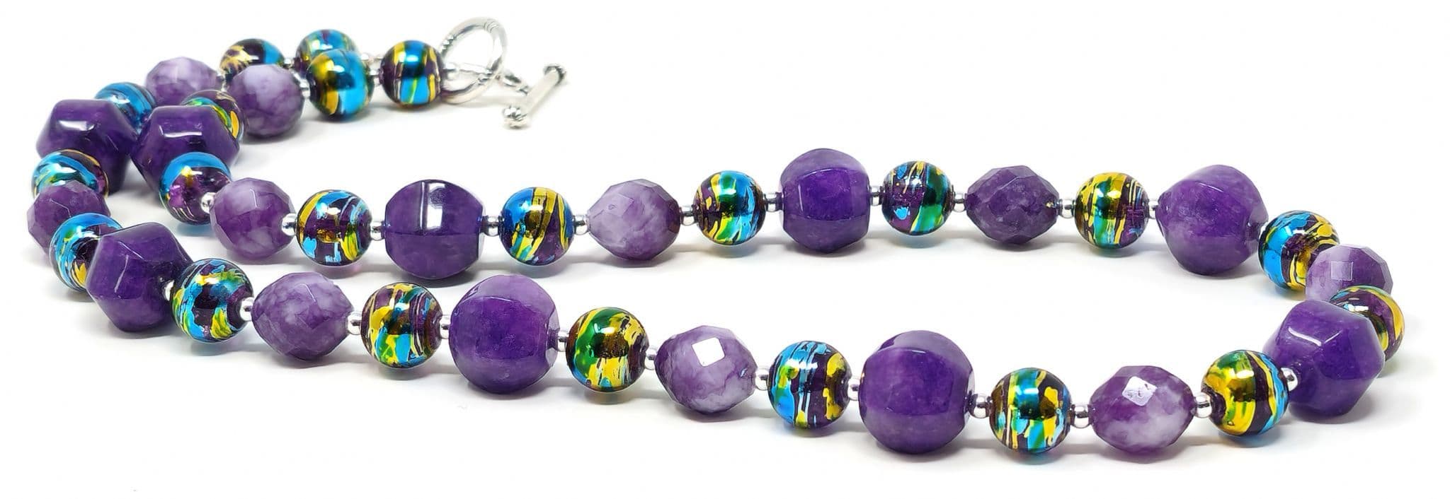 Purple semi-precious gemstones alongside colourful glass beads.