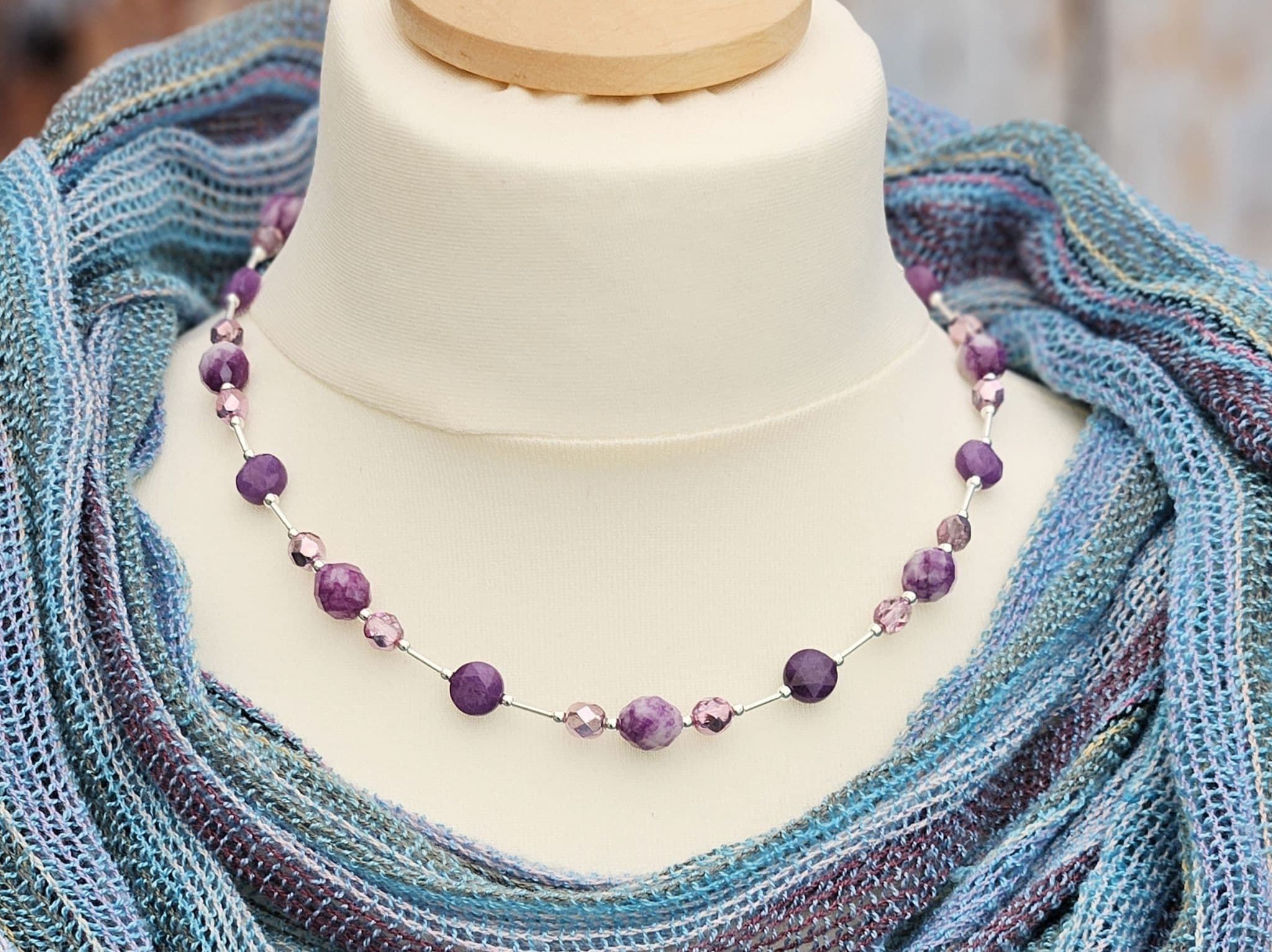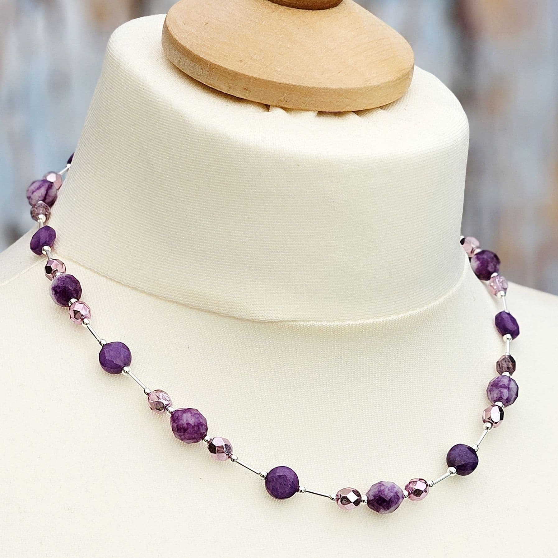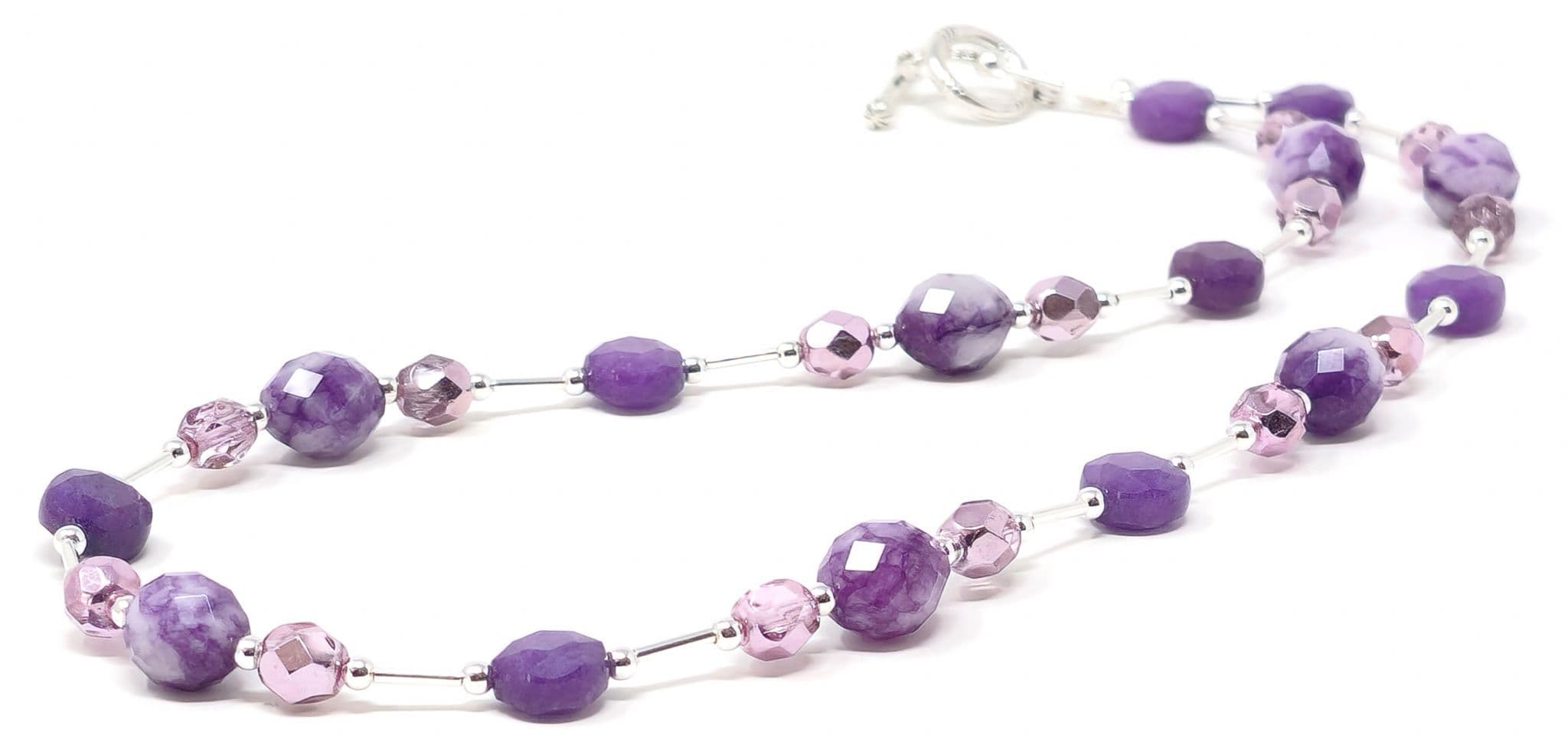 Purple semi-precious gemstones in 2 different shapes alongside faceted crystal glass beads.