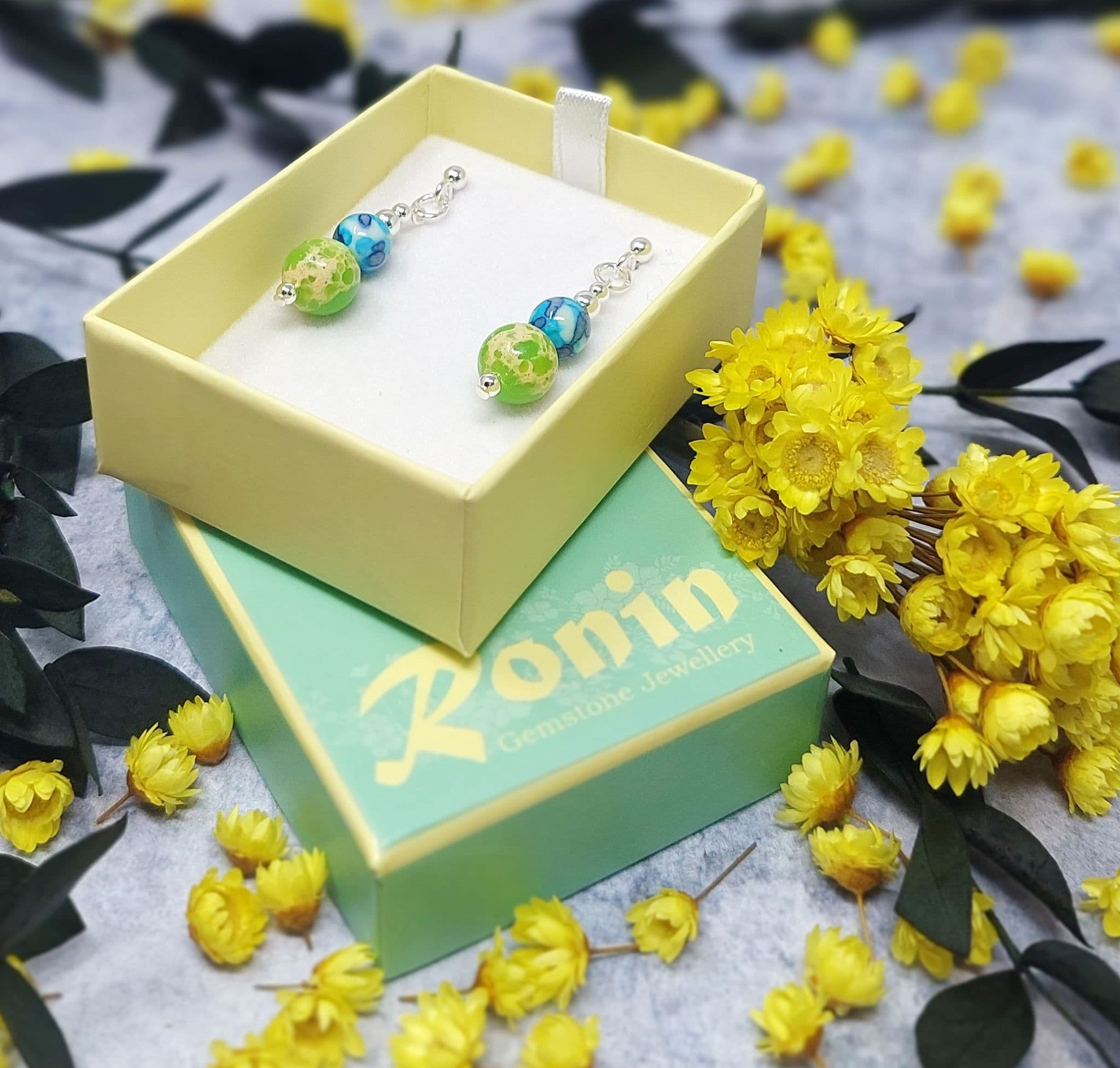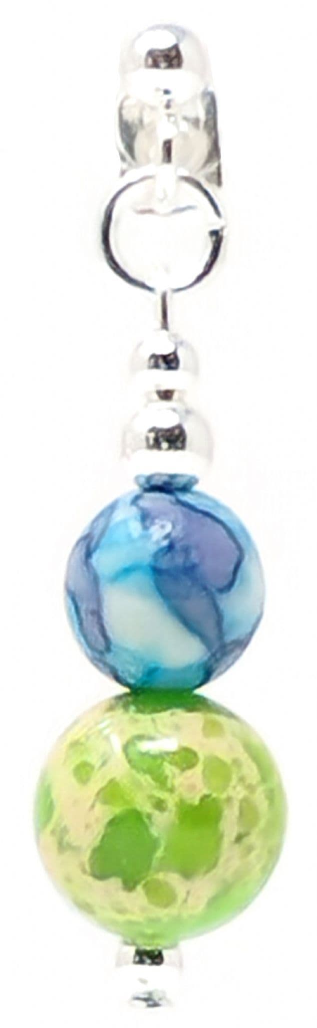 Vivid green & blue patterned gemstone beads. Silver plated spacer beads.